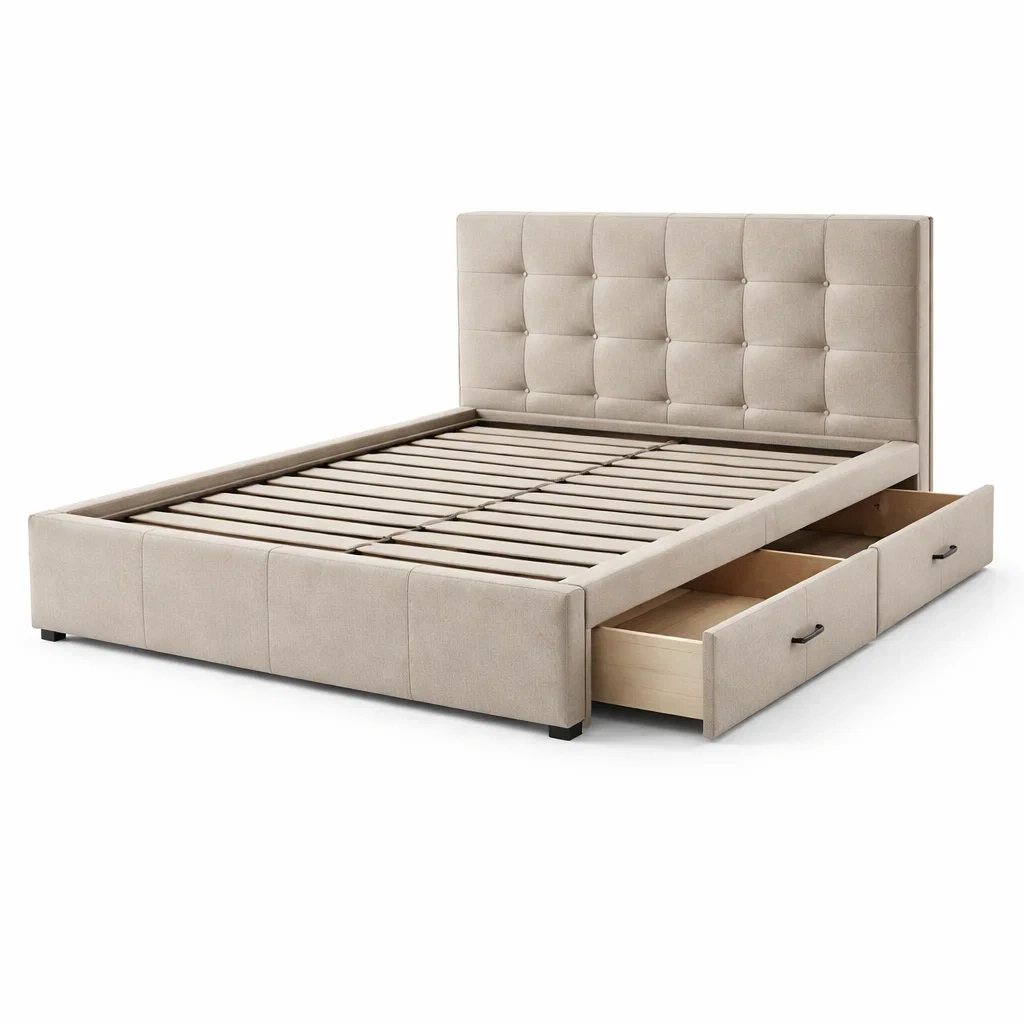 Lit avec rangement double en bois avec tiroirs et tête de lit rembourrée en tissu beige