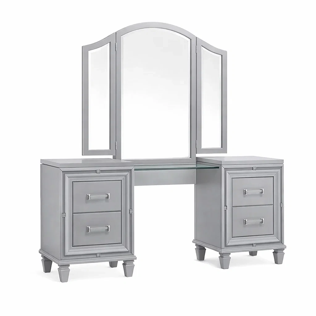 La coiffeuse est fabriquée en bois avec une finition laquée argentée. Elle comprend un miroir triptyque en verre trempé de 5 mm d'épaisseur. Les deux commodes sont pourvues de tiroirs spacieux pour le rangement.