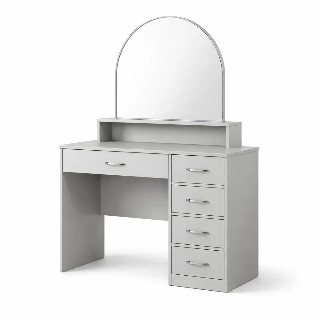 Coiffeuse équipée d'un miroir arquée et de quatre tiroirs pour rangement additionnel.