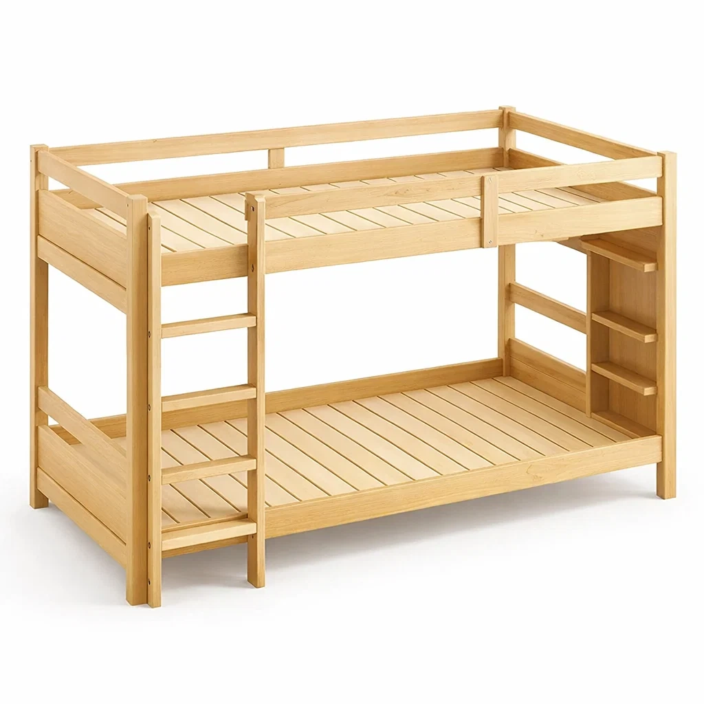 Fonctions : Lit superposé avec étagères intégrées.